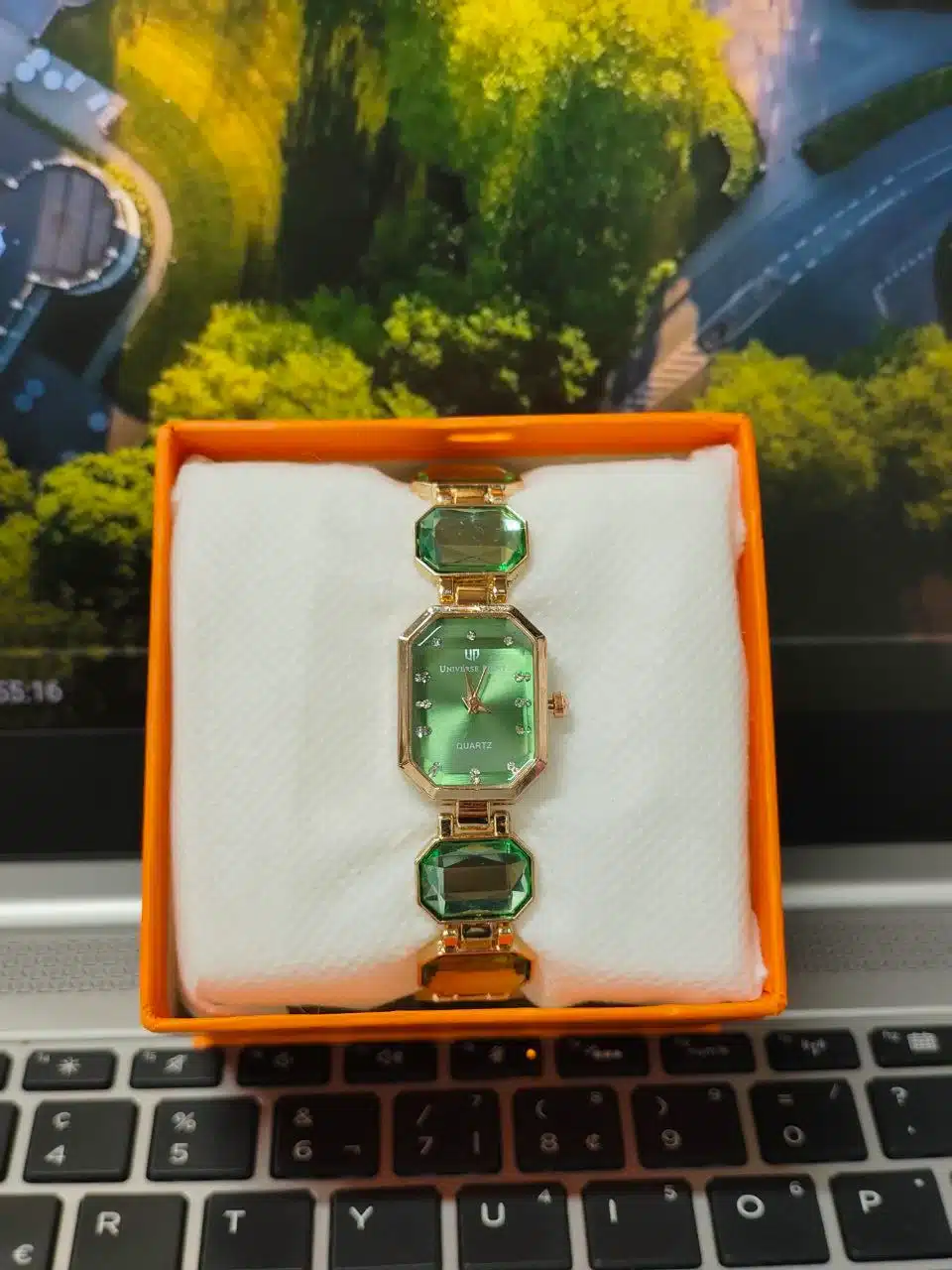 Designed with a stylish bracelet band and sparkling rhinestones, this watch combines fashion and functionality for modern women. Perfect for casual wear, office settings, or special occasions, it enhances any outfit with its vibrant emerald green accents.