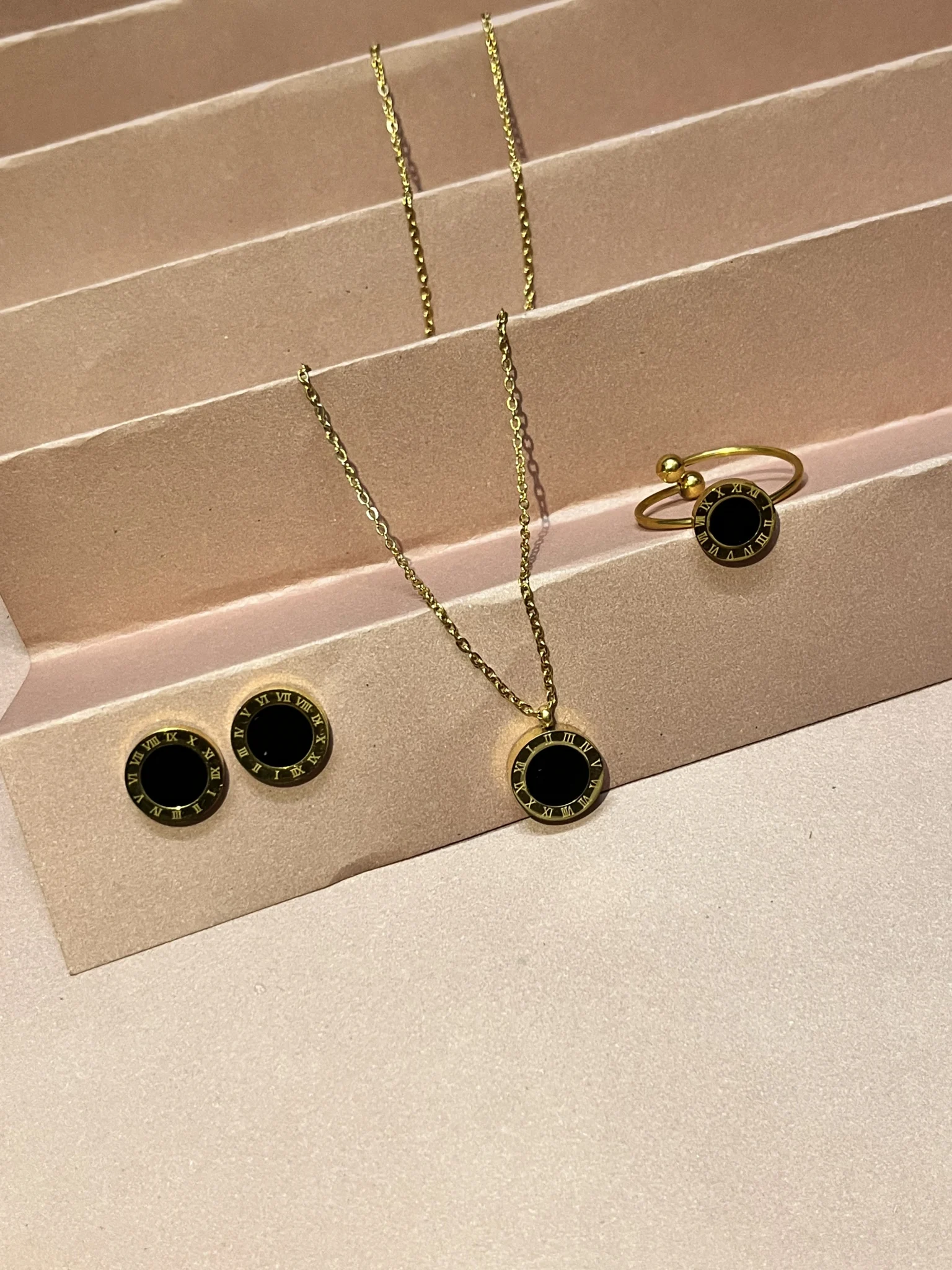 Elevate your style with this elegant Sleek Black Face & Classic Roman Numerals Jewelry Set. Includes earrings, ring, and necklace — durable, tarnish-free, and perfect for daily wear or gifting.